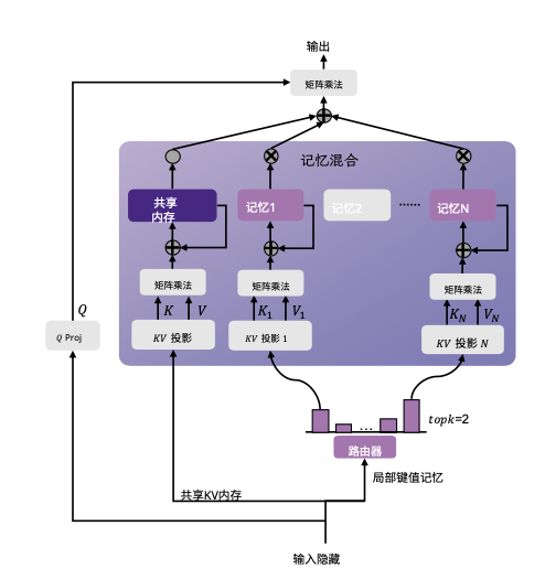 将MoE的思想搬到线性注意力上,用一个线性层为输入生成分数,然后选择top-k个记忆进行线性注意力计算.对于每个记忆,使用和计算线性注意力相同的方式计算,最后将多个记忆的结果进行加权求和.(权重是归一化后的top-k分数)
